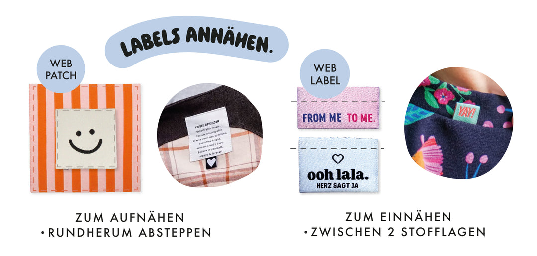 Je nach Art unterscheiden sich unsere Labels in der Verwendung. Die Grafik zeigt dir, wie Webpatches und Weblabel vernäht werden können.